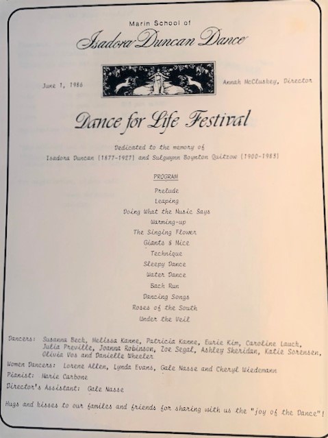 Annah G McCluskey directed this Fifth Annual Tribute/Recital, a Dance For Life Festival, dedicated to Isadora Duncan and Sulgwynn Quitzow in Tiburon on June 1, 1986.